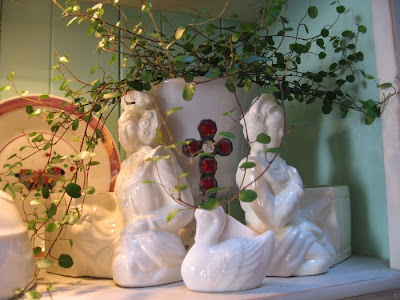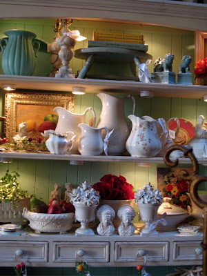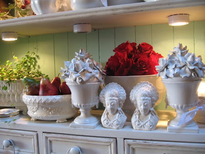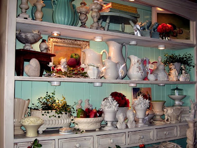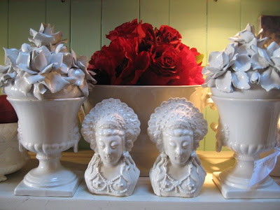 Has it really been that long? Guess we have been busier than we thought! This is one of our favorite vignettes in the store currently. Loads of white porcelain, ironstone, blanc de chine. Peppered with spots of luscious red and with a backdrop of aqua, Elena's favorite color.